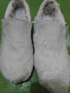 方法:把洗完的鞋子趁還溼溼的,讓衛生紙黏緊包覆帆布,拿去通風處斜放陰乾。